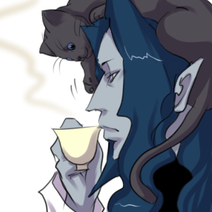 ぬこさまにいぢられながら優雅に茶をすする伯爵。